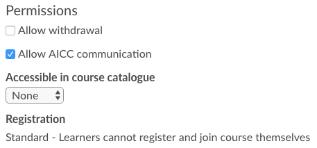 Wenn Sie die gemeinsame Verwendung Ihres Kurses in der Community ermöglichen möchten, müssen Sie die AICC-Kommunikation in den Kurseinstellungen aktivieren. Im Abschnitt Kurzanleitungen finden Sie Anweisungen zur Aktivierung von und Teilnahme an Kursen in der Community.