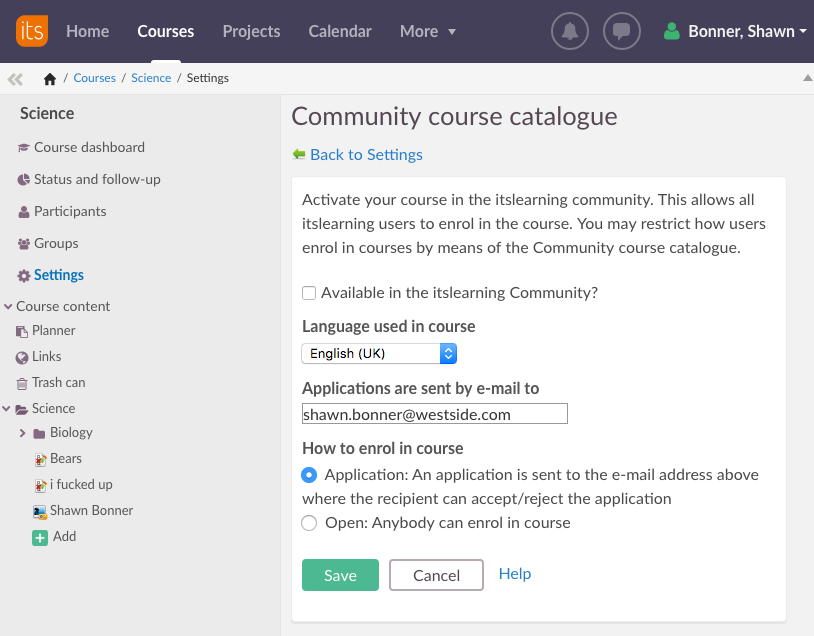 In der itslearning Community sind Kurse nicht automatisch verfügbar. Der für den Kurs verantwortliche Lehrer muss innerhalb der itslearning Community das gemeinsame Verwenden ermöglichen, damit externe Mitglieder teilnehmen können.