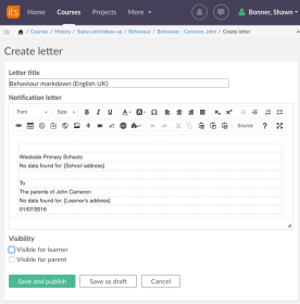 In den Systemen für Anwesenheit und Verhalten können Mitteilungen zum Verhalten oder zur Anwesenheit erstellt werden, die in gedruckter Form an die Erziehungsberechtigten des Lernenden geschickt werden können. Der Bericht wird normalerweise verschickt, wenn ein Lernender ein inakzeptables Verhalten aufweist oder häufig abwesend ist.