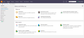 Der Link zu "Status und Nachbereitung" befindet sich in der Navigationsstruktur. Unter "Status und Nachbereitung" können Sie den Eintrag zur Beurteilung verwalten, die Anwesenheit verfolgen und eine Statusübersicht aller Elemente des Kurses sowie Berichte (persönliche Berichte, Fortschrittsberichte und Aufgabenberichte) einsehen.