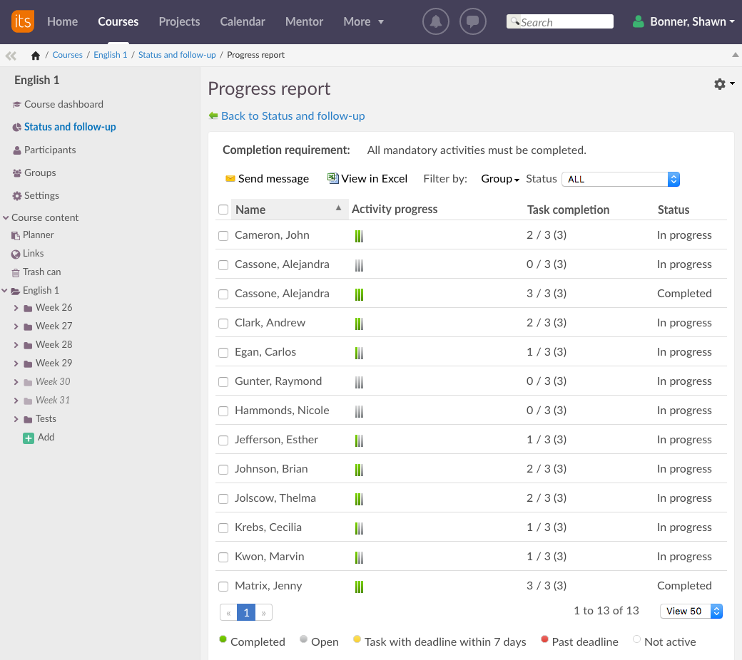 In dem Fortschrittsbericht wird der Fortschritt der Personen angezeigt, und zwar auf der Grundlage der von den Personen abgeschlossenen obligatorischen Elemente. "Nicht abgeschlossen" bedeutet, dass die Person nicht alle obligatorischen Elemente abgeschlossen hat. "Abgeschlossen" bedeutet, dass alle Elemente abgeschlossen sind.